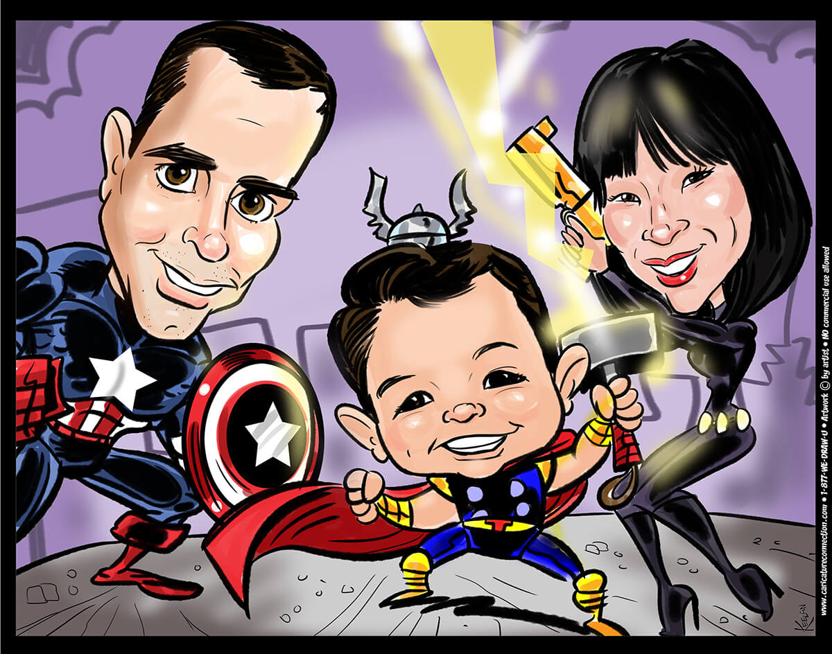 A GROUP caricature is a way to commemorate and reflect those milestone moments. Need a retirement gift from everyone in the office? Do you have an upcoming family reunion? How about a company holiday card? We can draw your specific group with any background or situation you choose. Our talented studio artists can draw up to 30 faces in one caricature.